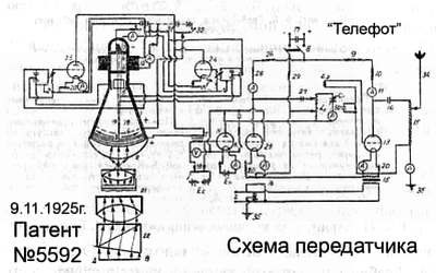«Передающая трубка. Первая мысль о создании такой трубки у меня возникла в 1923-24 гг., после изготовления электронного коммутатора, предназначавшегося для переключения фотоэлементов. Она состояла из стеклянной колбы, в узком конце которой находилась нить накаливания, способствовавшая истечению электронов тонким пучком. На пути электронного пучка устанавливались две диафрагмы с небольшими отверстиями. Эти меры принимались с целью уменьшения диаметра пучка. Далее луч проходил между двумя парами взаимно перпендикулярных отклоняющих пластин по направлению к редкой металлической сетке, находящейся под высоким потенциалом. С другой стороны сетки, в непосредственной близости от нее, у расширяющегося конца стеклянной колбы помещался сплошной светочувствительный слой. При изготовлении слоя использовался натрий, калий, цезий, рубидий и другие вещества, потенциал которых, по сравнению с сеткой, несколько снижен. Электронный пучок ослаблялся или усиливался в зависимости от интенсивности встречных электронов, вылетающих с освещенных участков светочувствительного слоя.