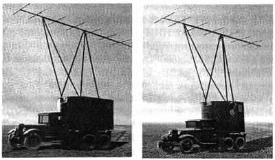 Рис. 45. Первая отечественная РЛС дальнего обнаружения «Редут» (РУС-2), двухантенный вариант с синхронным вращением кабин. Передатчик на ЗИС-6, приемник на ГАЗ-ААА, 1940 г.