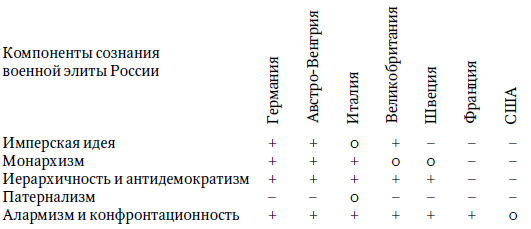 Результаты исследования показывают, что наибольшая степень корреляции, а значит, близости представленческих систем военных элит наблюдается при сопоставлении российского «военного склада ума» с менталитетом военной верхушки Германии, Австро-Венгрии и Италии. В меньшей степени эта корреляция характерна для Великобритании, Швеции и особенно Франции. Совершенно обособленно положение США, военная элита которых еще не сложилась к началу трагических событий 1914 года.