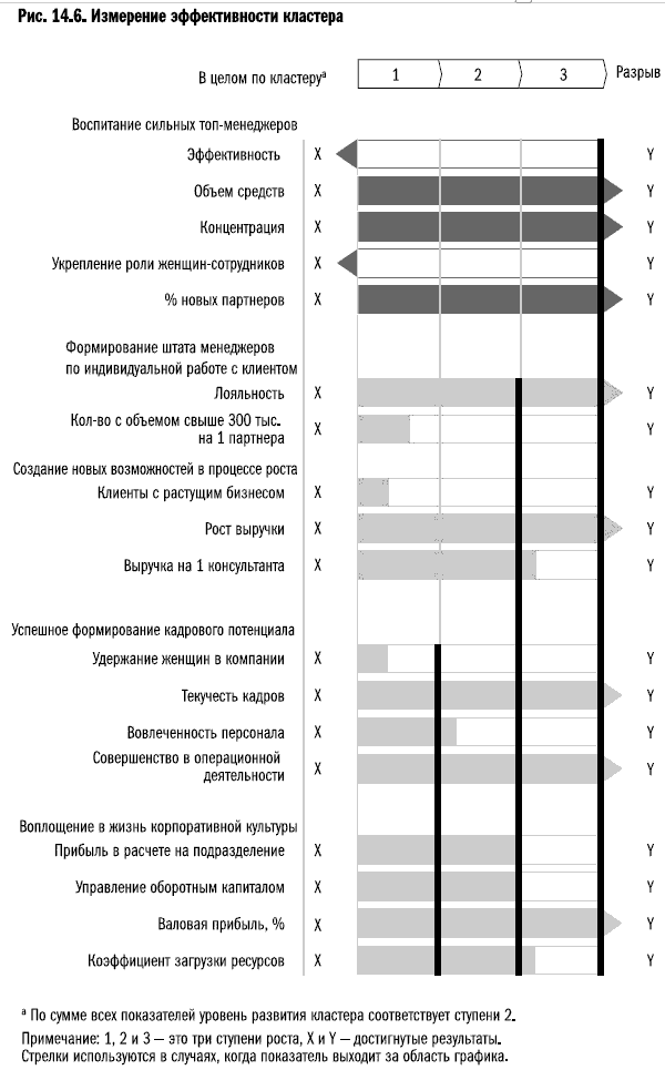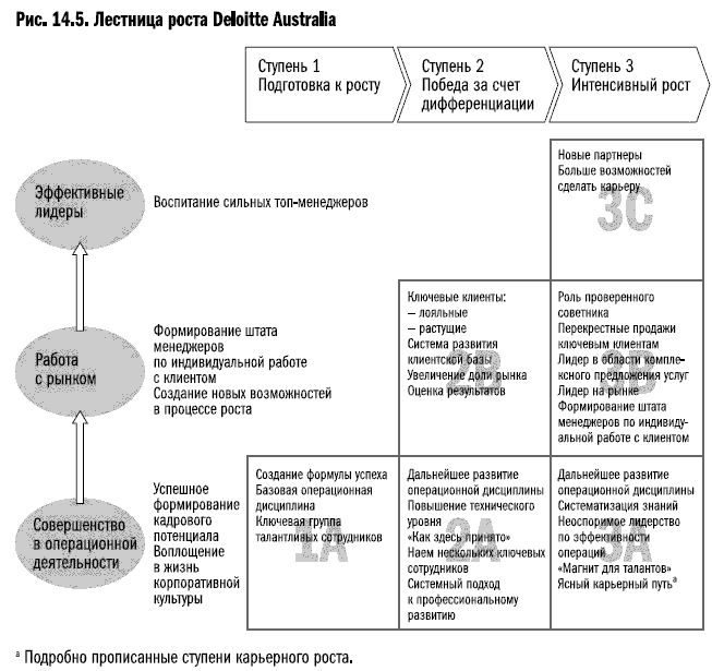 На первой ступени перед Deloitte стояла задача достичь совершенства в операционной деятельности. Для перехода на следующую ступень каждый кластер должен был обеспечить высокое качество оказываемых услуг при определенном уровне рентабельности. На второй ступени предполагалось увеличить клиентскую базу и добиться роста выручки. Это автоматически означало увеличение прибыли, поскольку рентабельность следовало обеспечить еще на первой стадии. На третьей ступени необходимо было устранить дефицит компетентных руководителей, то есть воспитывать и нанимать больше сотрудников в статусе партнера, способных обеспечить рост кластера в новых направлениях. Такого же плана действий Deloitte придерживалась в прошлом при развитии самых успешных направлений своего бизнеса.