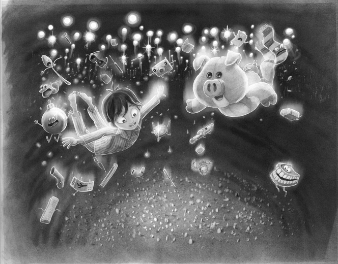 Думая о том, какой Рождественский Поросёнок грубиян и как он в этом похож на Холли, Джек вслед за ним дошёл до ступеней. Там Поросёнок показал ему, как перебираться с одной на другую – Джек стал таким крошечным, что перила казались ему небоскрёбами. Они отбрасывали зловещие тени на спускавшихся на первый этаж мальчика и поросёнка.