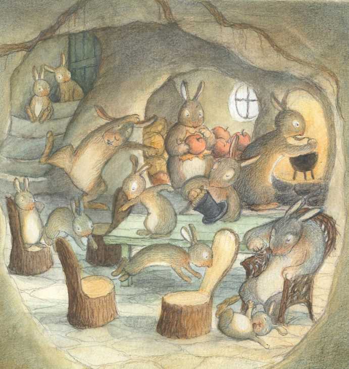 Мама-крольчиха варит капустный сок. Тётя Инка протирает зимние яблочки и, завернув каждое в кленовый лист, аккуратно складывает в углу. Дядя Кина делает гимнастику. Папа-кролик чистит свой цилиндр. А дедушка думает. Он любит думать. Вот сейчас он думает, почему, когда что-то падает, оно падает именно вниз.