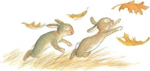 Они пытаются поймать лист, но ветер снова и снова подхватывает его, уводя крольчат всё дальше и дальше от дома.
