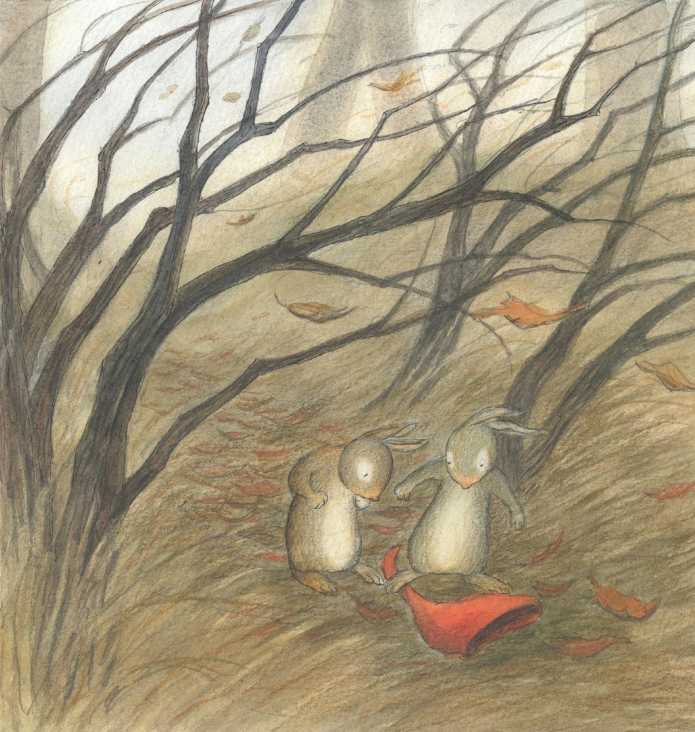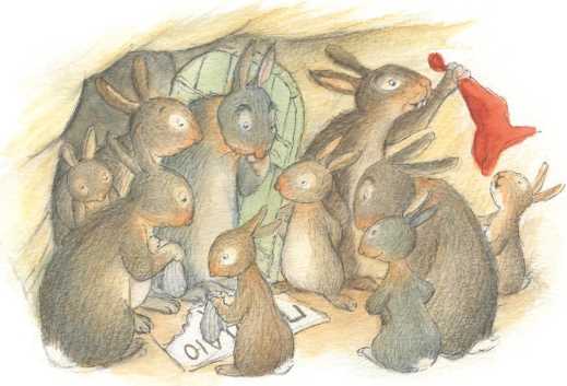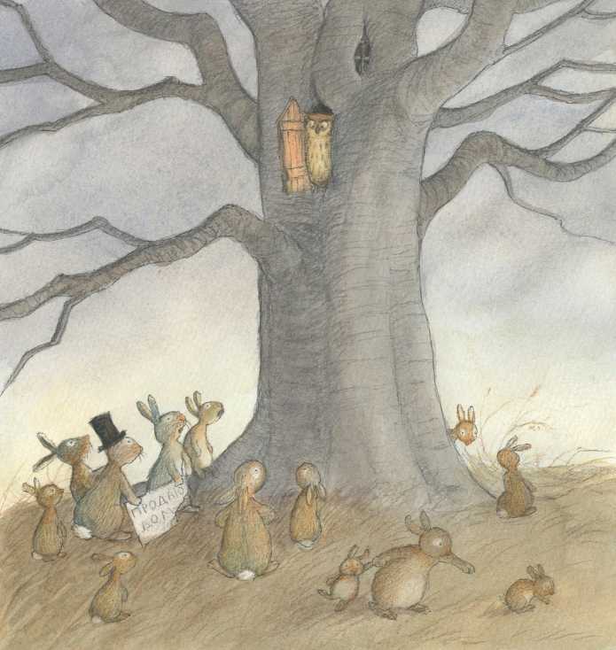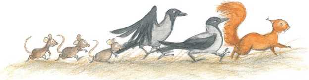 Нести табличку кроликам помогают белка и несколько лесных мышей, которых они встречают по дороге. И две вороны.