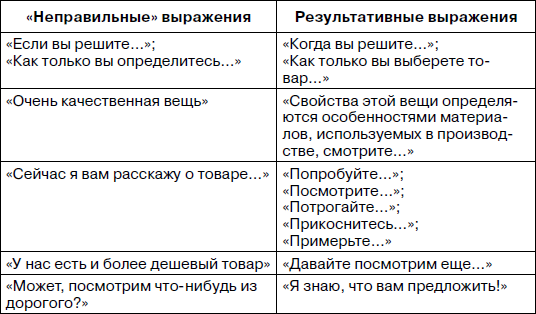 При общении с клиентами в торговом зале нужно следить за тем, какие слова и выражения используют консультанты. Часто работники не замечают, что применяют «неправильные» выражения, препятствующие немедленной покупке. Любое из них и аналогичные им могут на подсознательном уровне вызвать у покупателя сомнения, а иногда и вовсе заставить отказаться от покупки именно у вас в магазине. Потренируйте с продавцами эффективные фразы, которые приведены в табл. 3.2.