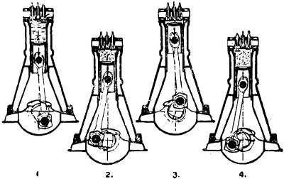 Схема работы, двигателя Дизеля: 1 — всасывание; 2 — сжатие; 3 — рабочий ход; 4 — выхлоп