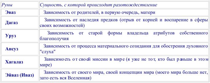 Развитие личности проходит через последовательные фазы идентификаций (отождествлений) и разотождествлений. Образцы для идентификаций берутся изнутри (заложенные в генетической памяти) и снаружи — родительские сценарии, значимые другие. Смена образцов идентификации подчиняется закону диалектики: "отрицание отрицания", по которому старое свергается новым и сильным, а то в свою очередь сменяется еще более современным и сильным. Если идентификация реализуется механизмом впитывания личностью как промокашкой неких образов, то разотождествление возможно через механизм отражения, отталкивания, рефлексии, критического отношения к себе и другим. В этой системе соблюдается еще один закон диалектики "единства и борьбы противоположностей", центробежных и центростремительных сил, впитывания и отторжения. Накопление потенциала действия (количества) между полюсами противоположностей приводит к качественным скачкам в развитии, новым во внешнем проявлении и внутреннем содержании этапам. Теперь перед нами третий закон диалектики — "перехода количественных изменений в качественные". В рунах вполне наглядно отражаются последовательные ступени, как идентификации, так и разотождествления, хотя их сопоставление остается достаточно приблизительным. На самом деле каждая руна представляет собой ступеньку, элемент целостного сюжета нашей судьбы во всей ее многоплановости, в котором заложена дихотомия отождествлений — разотождествлений. Однако некоторые руны все же являются узловыми моментами развития после периодов относительно спокойного развития событий. В следующей таблице отражена последовательность идентификаций — отождествлений в личной биографии человека, начиная от рождения.