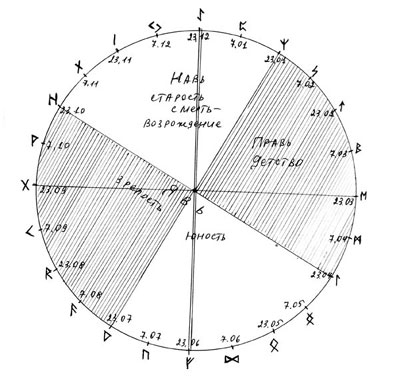 О самом шаманском, духовном посвящении вряд ли у меня есть столько же оснований рассуждать, как о героическом посвящении. Можно сказать, что если героическое посвящение связано с цепочкой идентификаций, то шаманское — с последовательностью разотождествлений. Эти два пути мне напоминают двойную спираль ДНК, будучи так же перевиты и, в сущности, неотделимы друг от друга. Только в начале круга (от рождения героя) в этой спирали явно толще героическая составляющая, а во второй половине постепенно набирает удельный вес вторая, духовная компонента. Рунный круг отражает полную реализацию человека в круге его судьбы, но она вовсе не значит, что любой человек проходит полноценно все стадии. Нужно немало: желание, возможности, необходимость. Урд, Верданди, Скульд…Снова три норны сидят возле источника Урд. Снова они режут руны и прядут нить судьбы. Пригласите их на свое рождение?