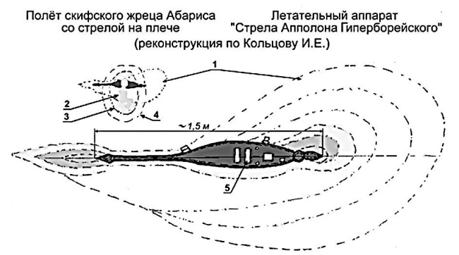 Для того чтобы получить некоторое представление об уровне развития скифов необходимо вспомнить то, что написано о деяниях Прометея и Зевса, осуществлявших вместе внедрение различных новшеств в жизни людей. В древних источниках говорится, что Прометей дал людям искусство нового письма и счета (очередная реформа письма для забвения прошлого Золотого века, при котором правил Крон – отец Зевса). Письменность была и ранее, в легендарной Атлантиде, Египте, на Востоке, задолго до рождения Прометея и Зевса. Сведения об этом имеются в Тибете, Гималаях, Египте. Известно, что скифы вели переписку с персидскими царями Киром II и Дарием, с Александром Македонским. Скифия с древнейших времен обладала письменностью и большими знаниями. Не зря территория Скифии (России) привлекла к себе внимание своей сакральностью многих выдающихся людей мира. Большое впечатление на греков производили приезды скифских жрецов, философов и других образованных людей. Так, например, скифский жрец Абарис делал достоверные предсказания о землетрясениях, успокаивал бурные ветры, усмирял речные и морские волнения. На привезенной стреле Аполлона Гиперборейского он переправлялся через реки, непроходимые места, перелетая над ними по воздуху (см. рис. 26). Во время путешествий он совершал очищения и изгонял моровые болезни. Скифы имели систему образования и воспитания. Другой знаменитый скифский жрец Мерлин в Англии удивлял людей способностью творить чудеса. Он принял участие в строительстве культовых сооружений в Стоунхендже, легко перемещая и устанавливая громадные камни-менгиры, с которыми не могли справиться сотни людей. Он говорил, что на его родине в Скифии жрецы творят значительно большие чудеса. Мерлин родился в III в. до н. э. севернее Днепровских порогов, которые являются руинами каких-то циклопических сооружений.