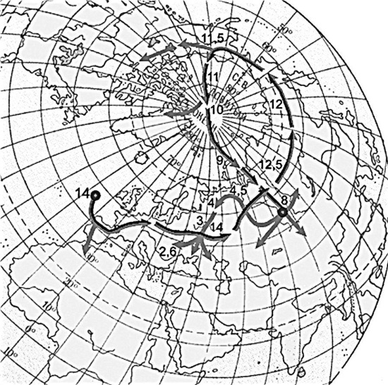Климат у Скифского океана был мягким, поскольку рядом протекало теплое течение – Гольфстрим – вплоть до Таймыра, а вершины горных хребтов Менделеева, Ломоносова, Гаккеля еще возвышались над океаном, и сильного оледенения не было. Но с наступлением холодов большинство скифских родов стали постепенно уходить с Полярного Урала (Кавказа) и бассейна р. Печора в юго-западном направлении. Широким фронтом они прошли через верховья Волги, Дона, Днепра, через Валдай до Прикарпатья, Северного Причерноморья и северного Кавказа (ранее современный Кавказ входил в состав горного хребта – Траверс – вплоть до Тянь-Шаня).