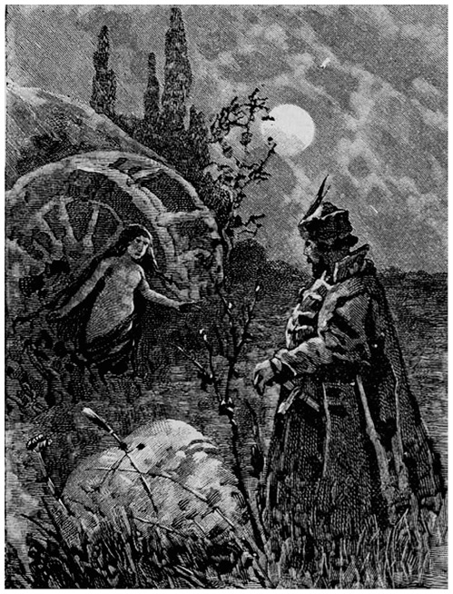 Шел по лесу один мужик, <…> смотрит, а они [русалки — В. Р.] за ним и турятся, все голые, растрепанные, кричат: «Подожди, кум, давай на качелях кататься!» Он крестится. Они отстали крошечку. Он снова сотворил молитву — вдруг явился светлый юноша в белой одежде, подал ему жезл, весь исписанный непонятными словами, и говорит: «Возьми себе этот жезл, Божий раб, с ним никто тебя не тронет!» Юноша стал невидимым. Русалки сначала заголосили в причет [ «рев, плач, причитанья» [1469] — В. Р.], потом забили в ладоши, захохотали и убежали в лес [1470] .