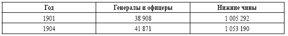 Численный состав войск на рубеже ХIХ—ХХ веков определялся складывающейся внутренней и внешней политической обстановкой, а также экономическими возможностями страны. Обострение внешнеполитической обстановки требовало значительного количества войск для обороны западных и дальневосточных границ. За период с января 1901 по январь 1904 г. численность офицеров выросла на 8 %, нижних чинов на 5 %.