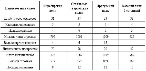 Отдельная гвардейская кавалерийская бригада состояла из лейб-гвардии уланского «Её Величества» и лейб-гвардии Гродненского гусарского полка. Кроме того, имелся Крымский дивизион из 2 эскадронов, в военное время он развертывался в полк (не входил в состав дивизий). Всего в Европейской России и на Кавказе имелось 384 эскадрона и 242 сотни.