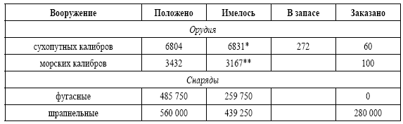 * Фактически недоставало 1274 орудия штатных калибров.