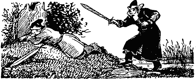 В ту самую пору случилось боярину, что сулился в десять дней съездить за мечом-кладенцом, мимо проходить. Смотрит он: царский гонец спит и рядом меч-кладенец лежит. Сперва боярин подивился, а потом выхватил саблю, отсек солдату Семену голову. Кинул тело в овраг, взял меч-кладенец и понес царю: