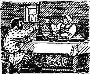 Потом старуха спохватилась, стала хлопотать, а солдат уговаривает: