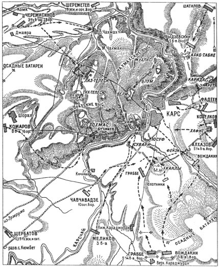 9 октября отряд генерала Лазарева подошел к Карсу. В октябре 1877 года Карс представлял собой одну из наиболее сильных крепостей Азиатской Турции. Крепость имела четыре группы укреплений с высотой валов до 6 метров и толщиной до 10 метров, с каменными казематами, казармами и пороховыми погребами. Укрепления были связаны между собой траншеей полного профиля, между ними стояли полевые батареи. Впереди укреплений и траншей имелись рвы глубиной до 3 метров и шириной до 18 метров, волчьи ямы в 3-5 рядов, самовзрывающиеся фугасы (петарды), сети и другие препятствия. Крепостная артиллерия состояла из 192 нарезных и 111 гладкоствольных орудий. Большую часть (77 из 111) гладкоствольных орудий составляли мортиры 5-, 2-, 1- и полупудового калибра. К началу осады гарнизон Карса насчитывал 25 тысяч человек. Комендантом крепости был Гуссейн-Хами-паша.