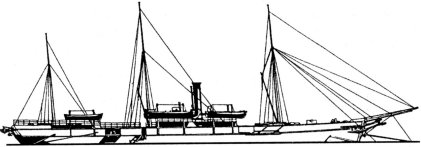 Транспорт минных катеров «Великий князь Константин», 1877 г. Водоизмещение 2500 тонн, длина 73 м, ширина 8,5 м, скорость 12,7 узлов, вооружение: 1 мортира калибра 152 мм, 4 девятифунтовые нарезные пушки, 4 большие шестовые мины, 4 минных катера