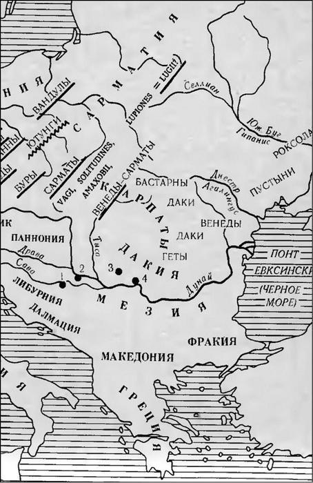 Рис. 5. Славянские топонимы Певтингеровой карты (обозначены точками с цифрами), отмеченные составителями первого тома «Свода древнейших письменных известий о славянах». Источник: Свод древнейших письменных известий о славянах. Т. 1. М., 1991