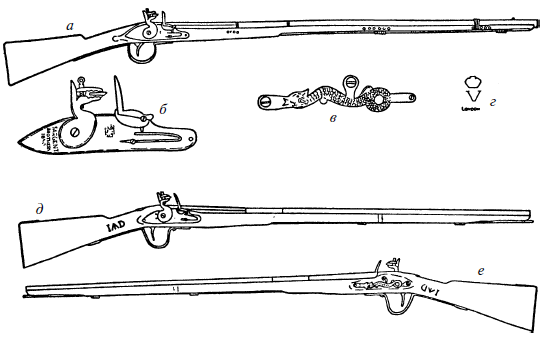 Рис. 25, a, б, в и г – коммерческий мушкет работы братьев Сарджент, Бирмингем, Англия, 1850 г.; д и е – коммерческий мушкет работы Уайтли, дата не определена. Ружье Сарджентов было осмотрено в коллекции Джулиуса Ганса, Санта-Фе, Нью-Мексико. Ружье работы Уайтли, один из самых замечательных экземпляров в описываемой здесь серии, был собственностью Бентона Кидуэлла из Южного Чарлстона, Огайо, который продал его Ассоциации музеев американского Фронтира, Лумис, Небраска, в 1954 г.