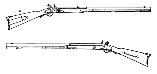 Образец, изображенный на рис. 36, а, типичен для этой винтовки. Ствол длиной 35 дюймов имеет семь нарезов и калибр 0,54 дюйма. На стволе восьмигранной у казенной части формы выбита маркировка – буквы «US» и орел поверх буквы «Р». Маркировка имеется и на полированной накладке замка, перед курком с плоским ударником – орел и щит с буквами «US» на нем; позади курка надпись «Harpers Ferry 1818». Затыльник приклада несколько вогнут внутрь, чтобы обеспечить лучший упор в плечо, в нем имеется полость для принадлежностей для чистки ствола, закрытая медной накладкой. Все детали фурнитуры сделаны из меди. Стальной шомпол закреплен ниже железного ребра, которое проходит под стволом и выступает на 3 дюйма из передней оконечности цевья. Спусковая скоба доходит до начала полупистолетной шейки ложи.
