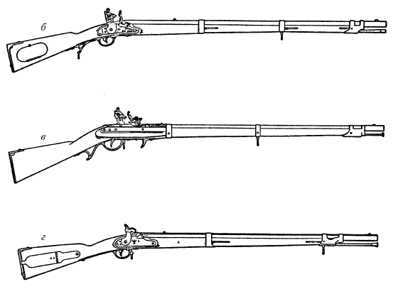 Рис. 36. Американские винтовки: а – американская винтовка образца 1803 г. (кремневый штуцер), два вида; б – американская винтовка образца 1817 г., кремневый штуцер («обычная винтовка»); в – американская винтовка системы Холла образца 1819 г., кремневый казнозарядный штуцер; г – американская винтовка образца 1841 г., капсюльной системы