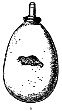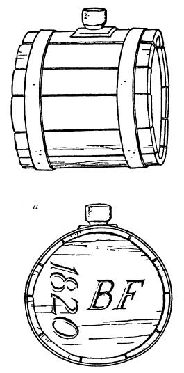 Жестяные банки, в которых производители пороха отпускали свой товар, использовались многими охотниками и для того, чтобы держать в них при себе запас пороха, необходимый во время охоты. Другие предпочитали для этих целей бочонки емкостью 61/4 литра, которые тоже делали производители пороха. Остальные же приспосабливали для этих целей металлические фляжки для воды или деревянные фляги. Одна подобная пороховница сохранилась в собрании Музея Лос-Анджелеса. Это деревянный бочонок круглой формы, сделанный из десяти бочарных клепок. Днища, имеющие примерно 9 дюймов в диаметре, сделаны каждое из цельного куска древесины со слегка вогнутой поверхностью. Два железных обруча шириной в 1 дюйм охватывают клепки. Одна из клепок шире, чем остальные, и имеет выступающую круглую площадку с просверленным в ней отверстием. Отверстие это закрывается деревянной пробкой. На одном из днищ вырезана марка «BF 1820» (см. рис. 40, а).