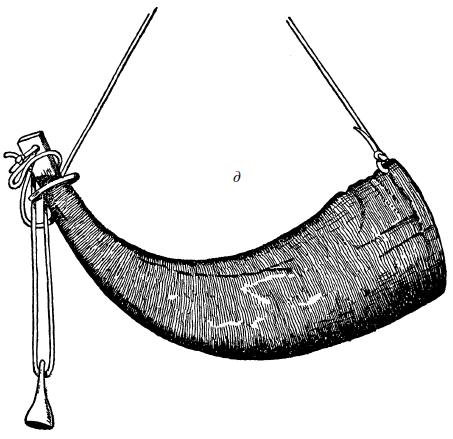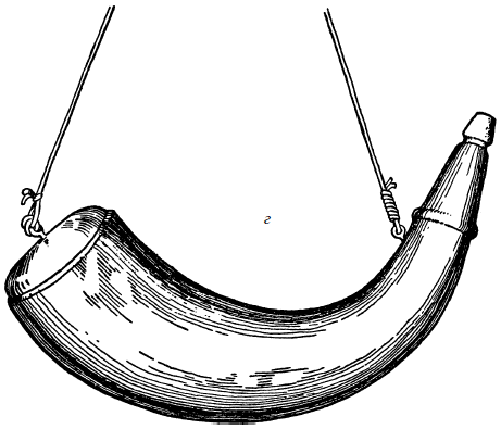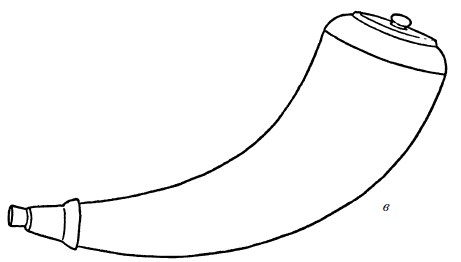 Рис. 40. Пороховницы из рога и других материалов: а – деревянный бочонок, использовавшийся как пороховница, два вида; б – свинцовая фляга для пороха Компании Гудзонова залива (украшена литой фигуркой бобра); в – 13-дюймовая роговая пороховница, сделанная из рога быка, была привезена из Теннесси в Огайо в 1802 г.; г – роговая пороховница из рога бизона, прекрасно отполированного; д – роговая пороховница из рога бизона, обработанного скребком, но не полированная