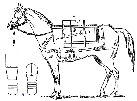 Рис. 54. Боеприпасы для горной гаубицы и способ их транспортировки: а – снарядные ящики, навьюченные на лошадь. Специальное вьючное седло позволяет артиллерийской прислуге разместить ствол поверх остальной поклажи; б – картечный выстрел и ядро для двенадцатифунтовой горной гаубицы