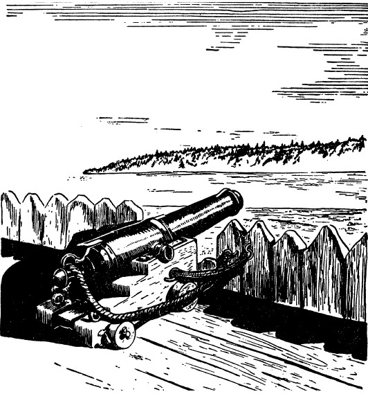 Рис. 55. Английское корабельное орудие, установленное на парапете форта Нискуалли примерно в 1833 г. Эта шестифунтовка была поднята с затонувшего английского корабля и установлена для защиты форта Нискуалли Компанией Гудзонова залива, недалеко от устья реки Нискуалли. Ныне оно установлено на парапете воссозданного форта в парке Пойнт-Дефианс города Такома, штат Вашингтон. Орудие направлено на юг и смотрит примерно на то мето, где оно стояло в прошлом