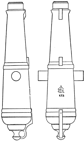 На рис. 53, а и б изображен ствол горной гаубицы Фримонта в виде слева и сверху. В «Наставлении по стрелковому делу» 1841 года издания указаны следующие параметры аналогичного орудия: длина ствола 32,9 дюйма; внутренний диаметр канала ствола 4,62 дюйма; длина канала ствола 28,16 дюйма; длина от казенной части до цапфы 15 дюймов; диаметр цапф 2,7 дюйма; диаметр дульного среза 6,9 дюйма. Вес отлитого из бронзы ствола составляет 220 фунтов. Параметры пушки Фримонта, за исключением несколько более короткого ствола, очень близки к указанным в «Наставлении».