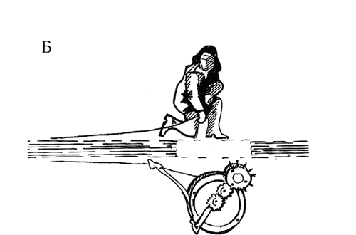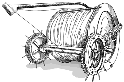Как видно из рис. 6, главная деталь лебедки – большой барабан с запасом тонкого и прочного шнура. Внутри барабан полый и заполнен пенопластом, а большинство деталей лебедки выполнено из пластика. В результате она имеет большую положительную плавучесть, которая прижимает к нижней кромке льда опущенную в майну лебедку. Через систему шестеренок вращение барабана передается на крайние шестерни, оснащенные острыми шипами, цепляющимися за лед. Металлический «рог» позволяет придавать опущенной под лед лебедке нужное положение, и к нему же крепится второй шнур, рабочий, за которым впоследствии протягивается сеть.
