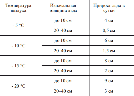 Но иногда все-таки приходится ловить на небольших глубинах, особенно по перволедью, до того как рыба скатилась в глубокие зимовальные ямы. В таком случае полезно измерить глубину водоема (не только на концах устанавливаемого порядка сетей, но в нескольких точках на его протяжении, чтобы не угодить невзначай на подводный горб). Затем, если ловля предполагается не однодневная, надо вычислить примерный прирост льда, пользуясь данными табл. 2. Цифры там указаны достаточно приблизительные: например, мутная или солоноватая вода замерзает хуже чистой и пресной, и, соответственно, прирост толщины льда происходит медленнее; большое влияние оказывают и другие факторы: глубина водоема, сила течения, толщина снежного покрова и т. д. Можно считать, что в таблице приведены максимальные значения – при условиях, наиболее благоприятных для замерзания воды.