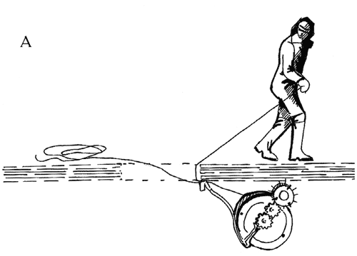 При помощи металлического «рога» лебедку направляют в ту сторону, где будет находиться вторая лунка, и туда же начинает движение рыболов, держа в руке конец шнура. Шнур сматывается, вращая барабан, он, в свою очередь, заставляет вращаться шестерни с шипами, – и лебедка ползет подо льдом следом за своим владельцем.