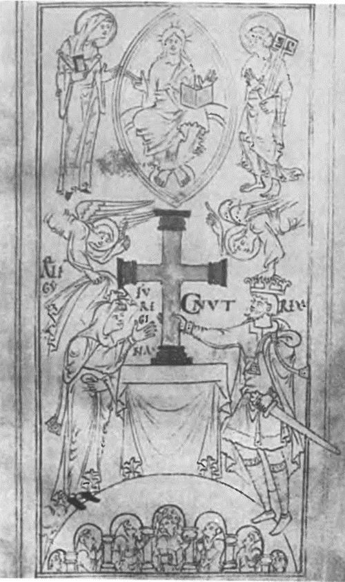 15. Король Кнуд и королева Эмма (Эльфгифу) вручают подарок для нового кафедрального собора, Винчестер. Из Британского музея. Ангелы держат покрывало королевы и корону короля и указывают пальцем на Христа, источник королевской власти. Прекрасный рисунок позднего «дозавоевательного» периода (1020—1030).