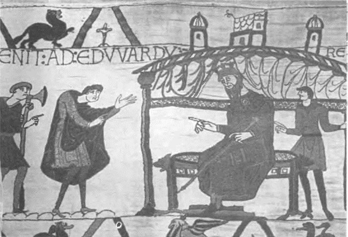 16. После возвращения из Нормандии Гарольд приходит к Эдуарду Исповеднику. С гобелена из Байо.