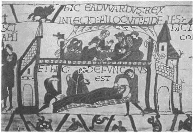 20. Смерть Эдуарда Исповедника. С гобелена из Байо. Сцена смерти Эдуарда расположена в центре длинной картины: слева от нее изображено, как его несут в Вестминстерское аббатство для захоронения, справа — Гарольд получает корону, а выше — коронация Гарольда (см. 10а). Почему события изображены в таком порядке, что получается, будто короля хоронят прежде, чем он умер? Видимо, отчасти это должно указывать на скорость, с которой Гарольд взошел на престол, а отчасти для того, чтобы не отделять смерть Эдуарда от вручения короны Гарольду. Человек, который протягивает корону Гарольду, указывает на двойную сцену, сцену предсмертной речи короля и его смерти.