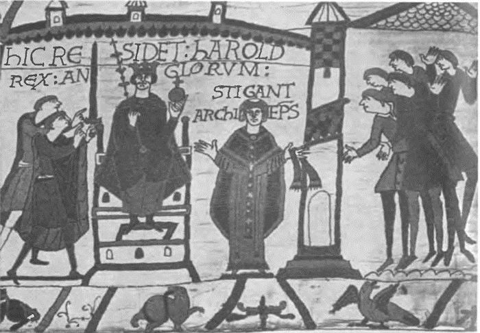 В этой сцене вместились три этапа коронационной церемонии. Справа стоящий архиепископ призывает народ выразить одобрение (или, возможно, принести вассальную присягу); слева Гарольду вручают меч; в центре изображен он сам сидящий на троне и в короне. Не показано, как архиепископ коронует Гарольда. Возможно, это сделал архиепископ Йоркский, потому что Стиганд был в опале. Но если так, то гобелен можно обвинить в хитрой пропаганде, так как любой человек решил бы, что архиепископ, который осуществлял collaudatio (или призывал к вассальной присяге), совершил и остальную часть церемонии.