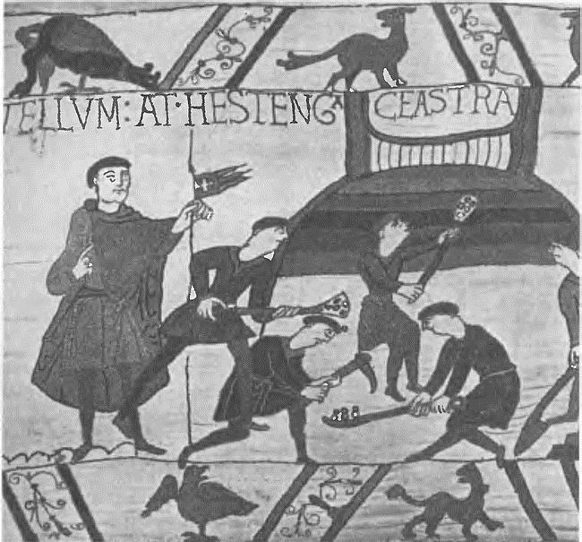 23. Укрепленный лагерь нормандцев в Гастингсе. С гобелена из Байо. Военачальник надзирает за строительством укрепления, холма с деревянной башней на его вершине.