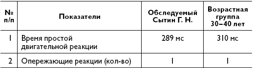 В целом можно сделать заключение, что по измеренным психо-физиологическим показателям организм Г. Н. Сытина функционирует на уровне более молодого возраста (30–40 лет), чем его календарный возраст – 75 лет.