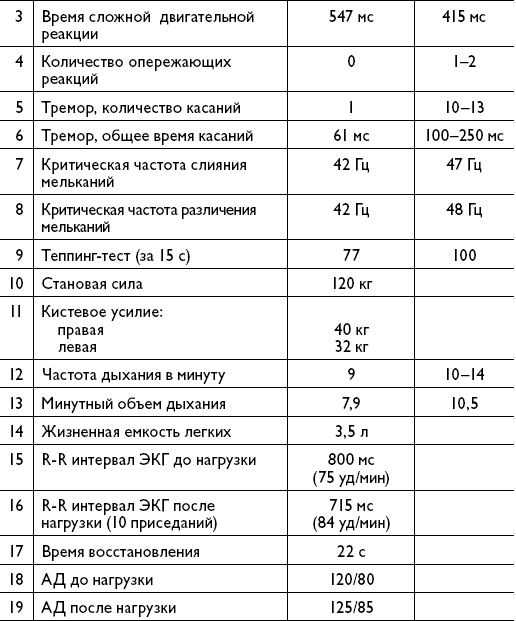 Как видно из приведенной таблицы, большинство измеренных показателей (время простой двигательной реакции (ВПДР), кол-во опережающих реакций, ошибок, тремор, кистевое усилие, частота дыхания, пульс, артериальное давление, реакция на нагрузку) соответствуют их значениям для возраста 30–40 лет.