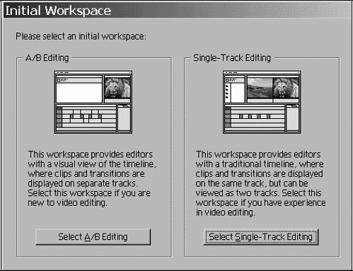 Если вы запускаете приложение Premiere 6.5 впервые после инсталляции, то через некоторое время, необходимое для загрузки (оно может быть довольно большим, если ресурсы вашего компьютера невелики), вы увидите диалоговое окно Initial Workspace (Начальная рабочая область) (рис. 1.1). Оно потребует от вас перед первым запуском программы определить наиболее подходящий для вас стиль редактирования. При последующих запусках это диалоговое окно не выводится, а выбранный вами режим редактирования будет загружаться автоматически.