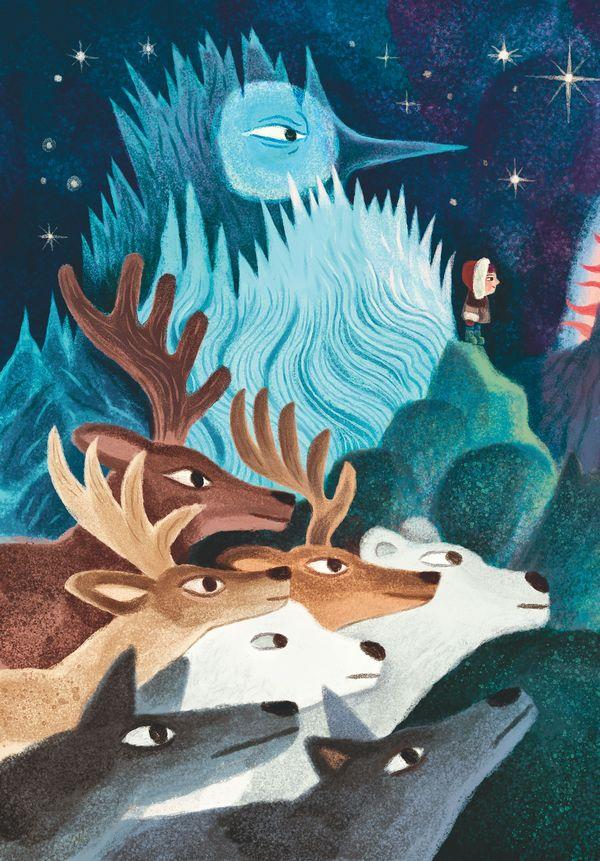 Он похож на низкорослую лошадку, шерсть у него серая, шея короткая, а его голову с большими ясными глазами украшают ветвистые рога. И, когда олень бежит, кажется, будто ветер проносится по горам и холмам, взметая снежные тучи.