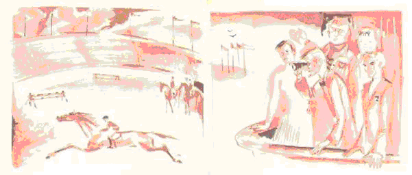 И вот они выезжают на ярко-зелёное поле ипподрома, где пестрят полосатыми боками препятствия. Громит оркестр, шумят трибуны, и кони нервно переступают точёными ногами.
