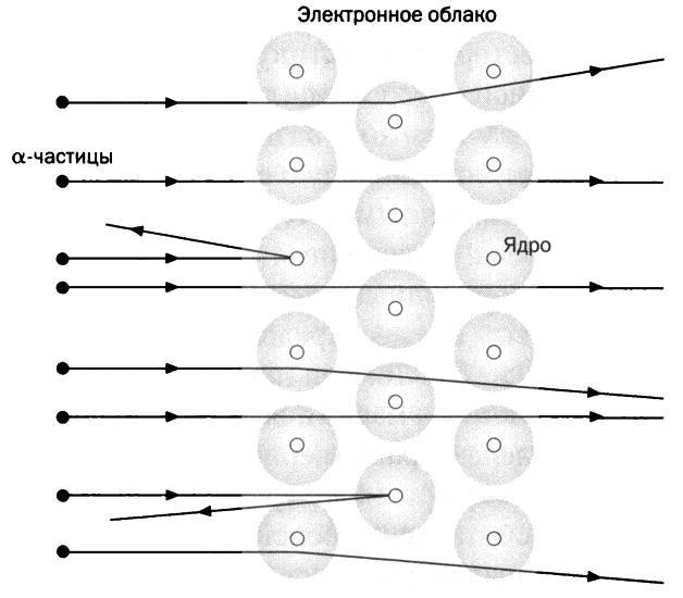 По настоянию Резерфорда Ханс Гейгер и Эрнест Марсден в 1909 году по ставили эксперимент, во время которого они бомбардировали тончайшую пластинку из золота толщиной в микрон (1 миллионная миллиметра, то, что ювелиры называют сусальным золотом) -частицами из радиоактивного источника. Ученые обнаружили, что большинство частиц пронизывает пластинку, практически не испытывая отклонений; некоторые испытывали небольшие отклонения (более 99% частиц отклонялись на угол менее 3°), и, к их удивлению, одна из 10 тысяч частиц отклонялась под углом больше 90° (то есть рикошетировала). Это последнее наблюдение было абсолютно необъяснимым с помощью модели атома Томсона. Резерфорд предположил планетарную модель атома, в которой атом был практически пустым, и именно по этой причине большинство -частиц не отклонялись от своей траектории при прохождении сквозь золотую пластинку. Рикошетировали те частицы, которые встречались с очень плотной положительно заряженной зоной, которую Резерфорд определил как атомное ядро. В ядре концентрировалась почти вся масса атома, а его радиус был в 10 тысяч раз меньше, чем радиус всего атома. В атоме электроны (отрицательно заряженные частицы с массой в тысячу раз меньше массы ядра) двигались по орбите вокруг ядра, как планеты вокруг Солнца. Эта модель предполагала другую проблему, поскольку, согласно классической физике, электроны на круговой траектории должны были терять энергию (обладая противоположным зарядом, они должны были притягиваться ядром) и в итоге упасть на него. Эту проблему через некоторое время решил другой ученик Резерфорда, Нильс Бор.