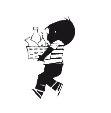 На кухне Саша взял кусок хлеба, бутылку молока и грушу. Он сложил всё в корзинку и пошёл в спальню.