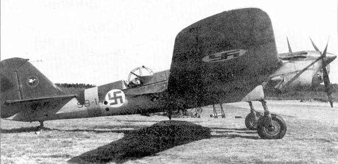 Финский СБ-2 номер SB-11 из 2/LeLv 6. Типичный камуфляж в виде пятен черного и темно-зеленого цвети на верхней стороне. Нижний камуфляж светло-серого цвета. Снимок сделан в Мальме, 1942 год.