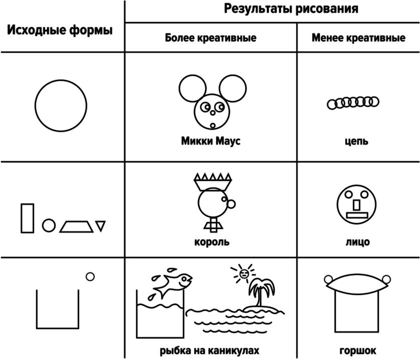 В 60-х годах прошлого века Элис Торренс разработал «Тест креативности», который носит теперь его имя. Тест, в целом, нехитрый: ребенку предлагают несколько фигур, а он должен дорисовать к этим фигурам что угодно, чтобы получилась картинка со смыслом. Картинка может оказаться интересной и креативной, а может – простенькой и в целом посредственной.