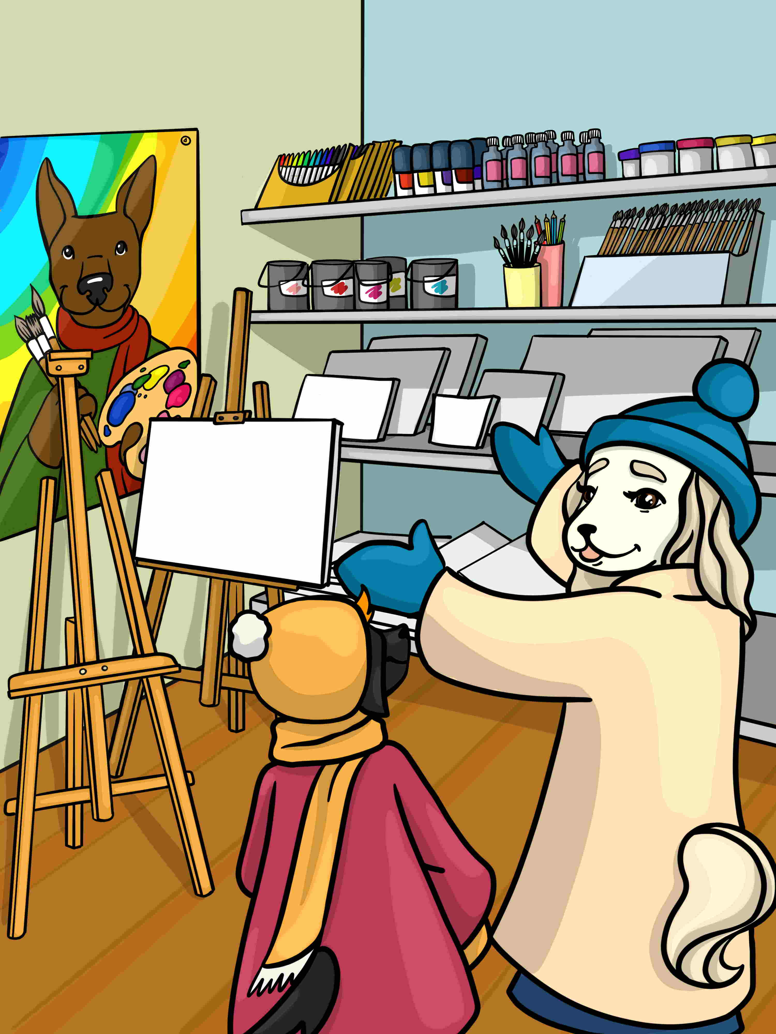 We turn to the left and then we walk straight for a while. We see a beautiful little shop. It has a big poster on its wall. On the poster is a dog with paints and a brush. The dog is smiling.
