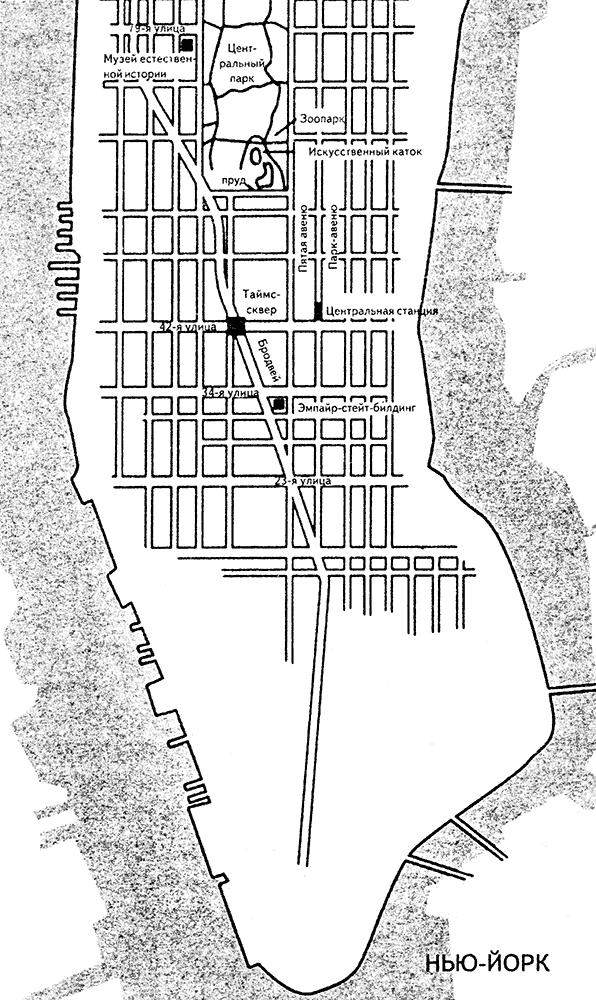 …На яблоне уйма яблок у нас, Ох, как они взоры манят!.. Но если в Нью-Йорке сыграешь джаз, То самое крупное — как ананас! — Считай, у тебя в кармане!Почти все улицы центральной части Нью-Йорка расположены под прямым углом друг к другу. А по диагонали их пересекает самая главная — Бродвей.